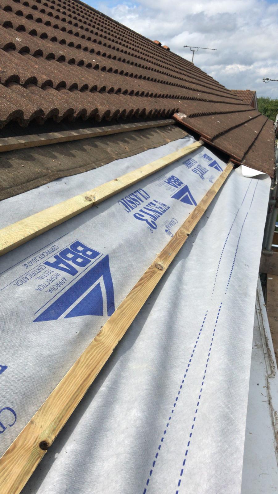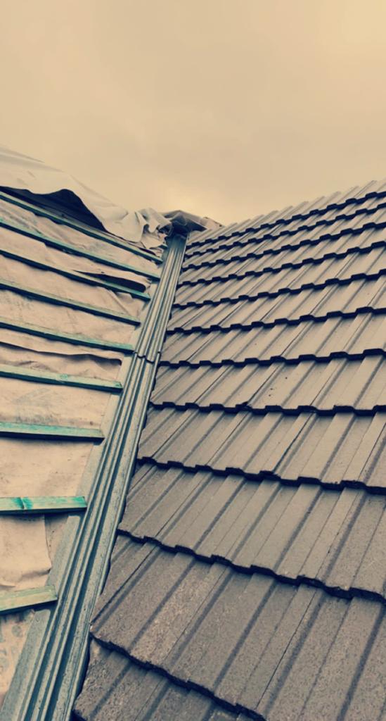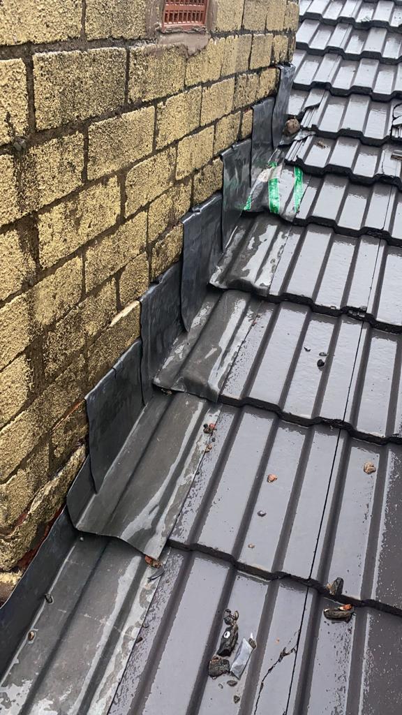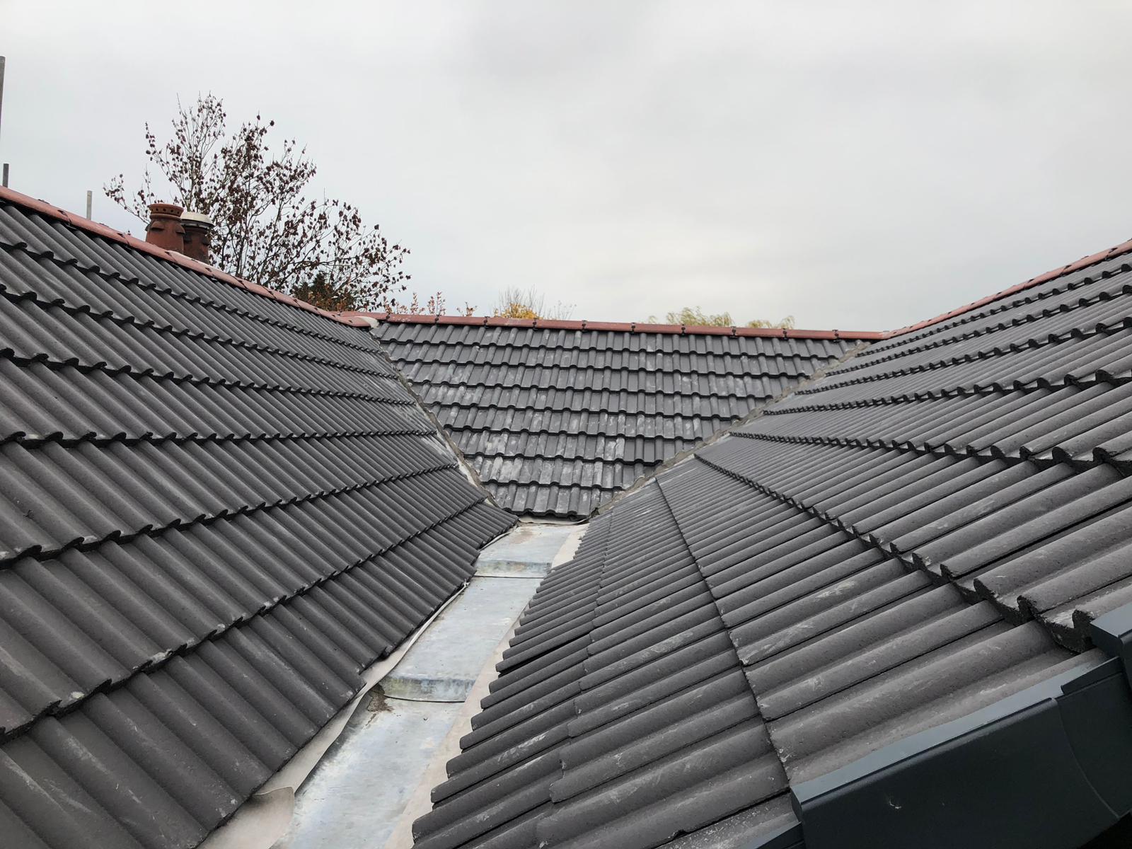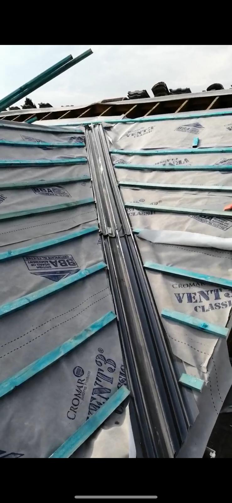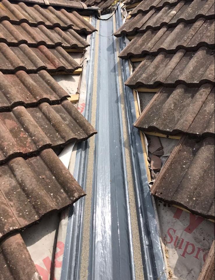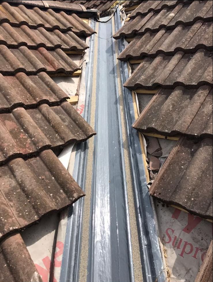 Old lead valley removed and a new maintenance-free dry valley system supplied and fitted with felt and batten replacement on the main roof.