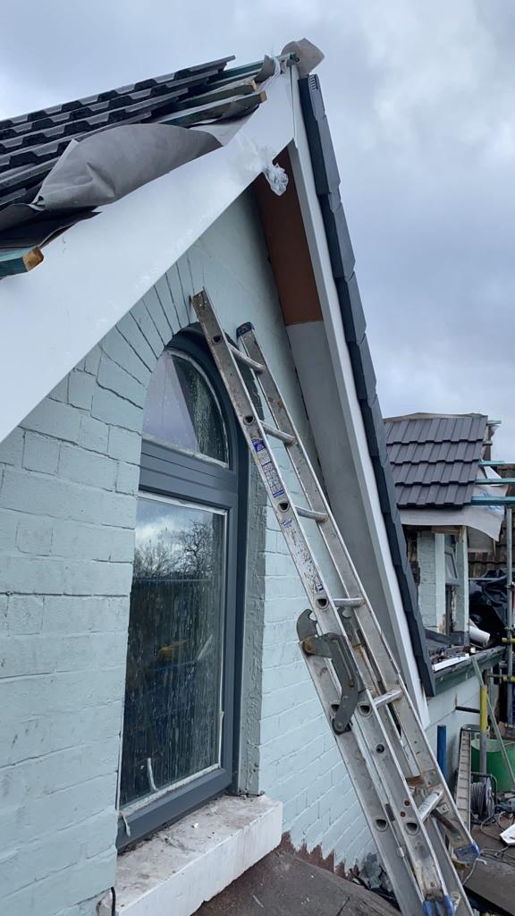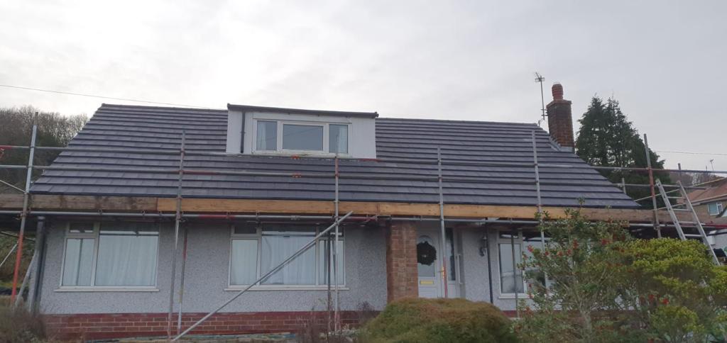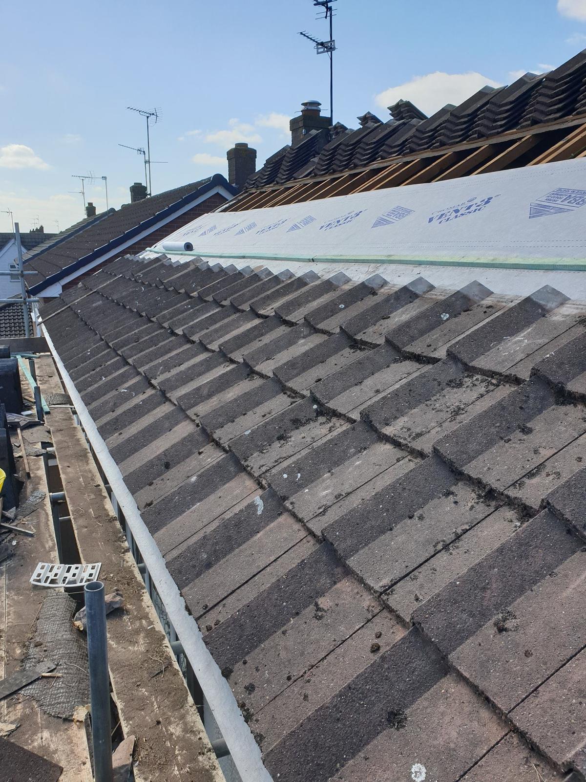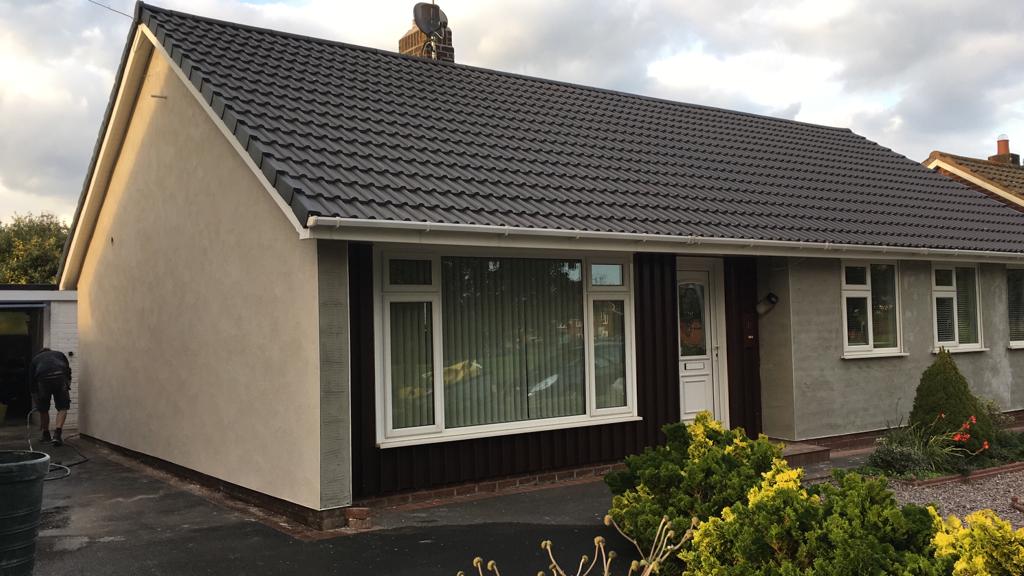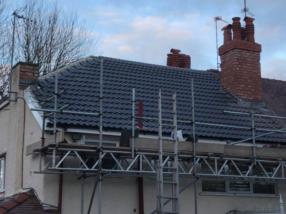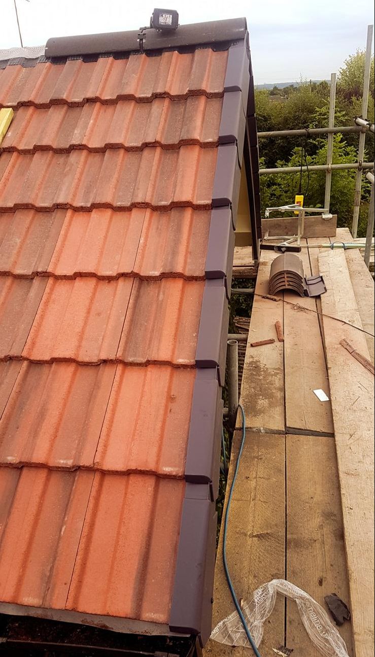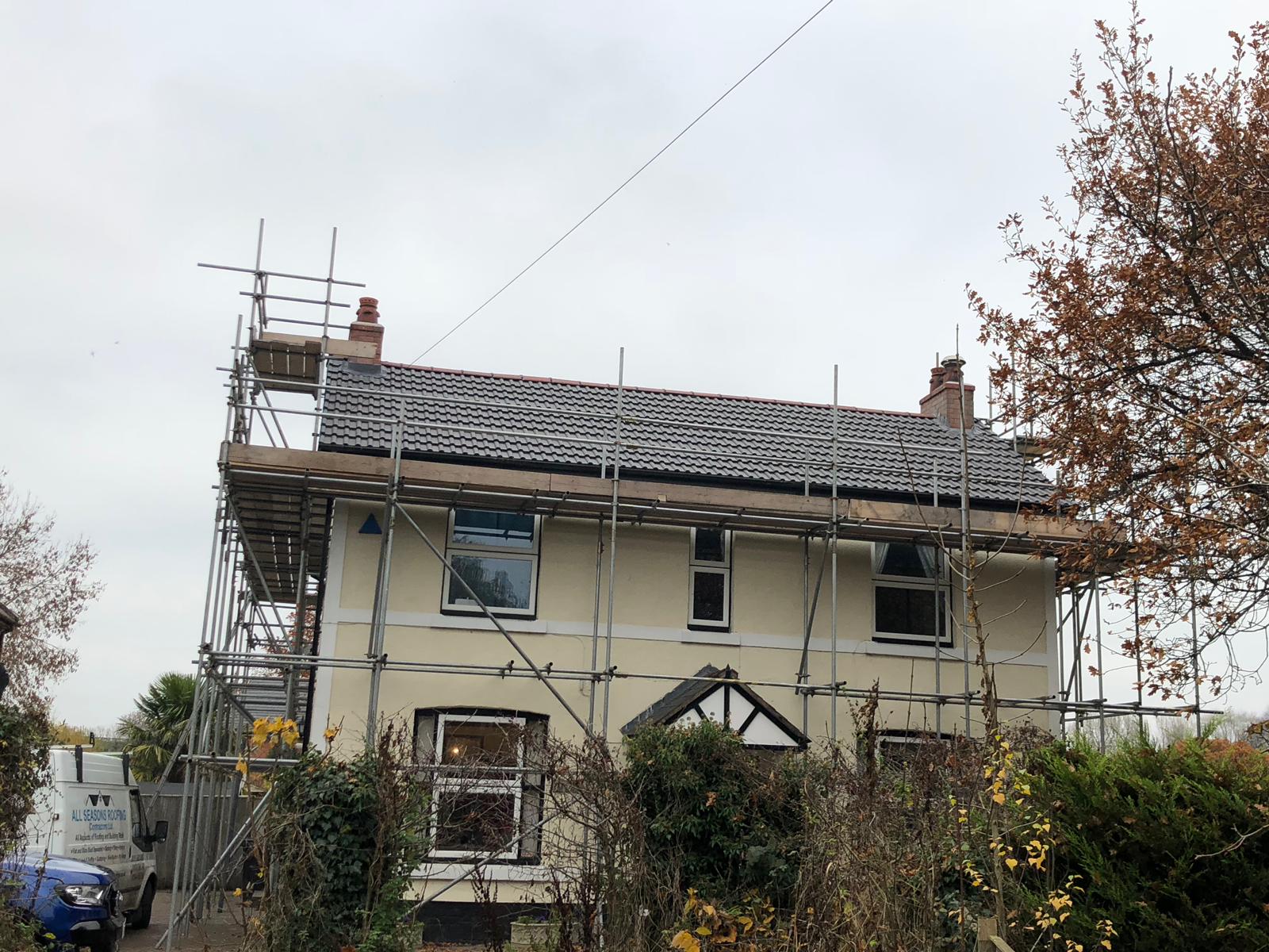 Here underway at All Seasons Roofing Contractors Ltd we have a complete new tile roof. Once the existing roof is completely stripped it will be fitted with all new breathable roofing membrane, all new roofing battens, and all new smooth grey tile, and all new matching ridges. New ridges will be fitted with a new dry ridge system. Along with that we are also fitting all new gable end timbers, all new UPVC fascia finished off with all new UPVC dry verge on the gable ends. Remember all our new roofs come with a 25 year guarantee and all UPVC work comes with a 10 year guarantee.