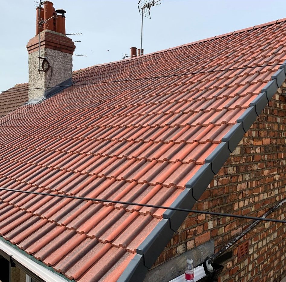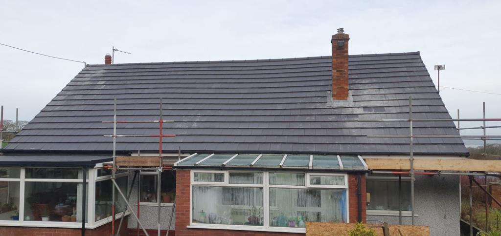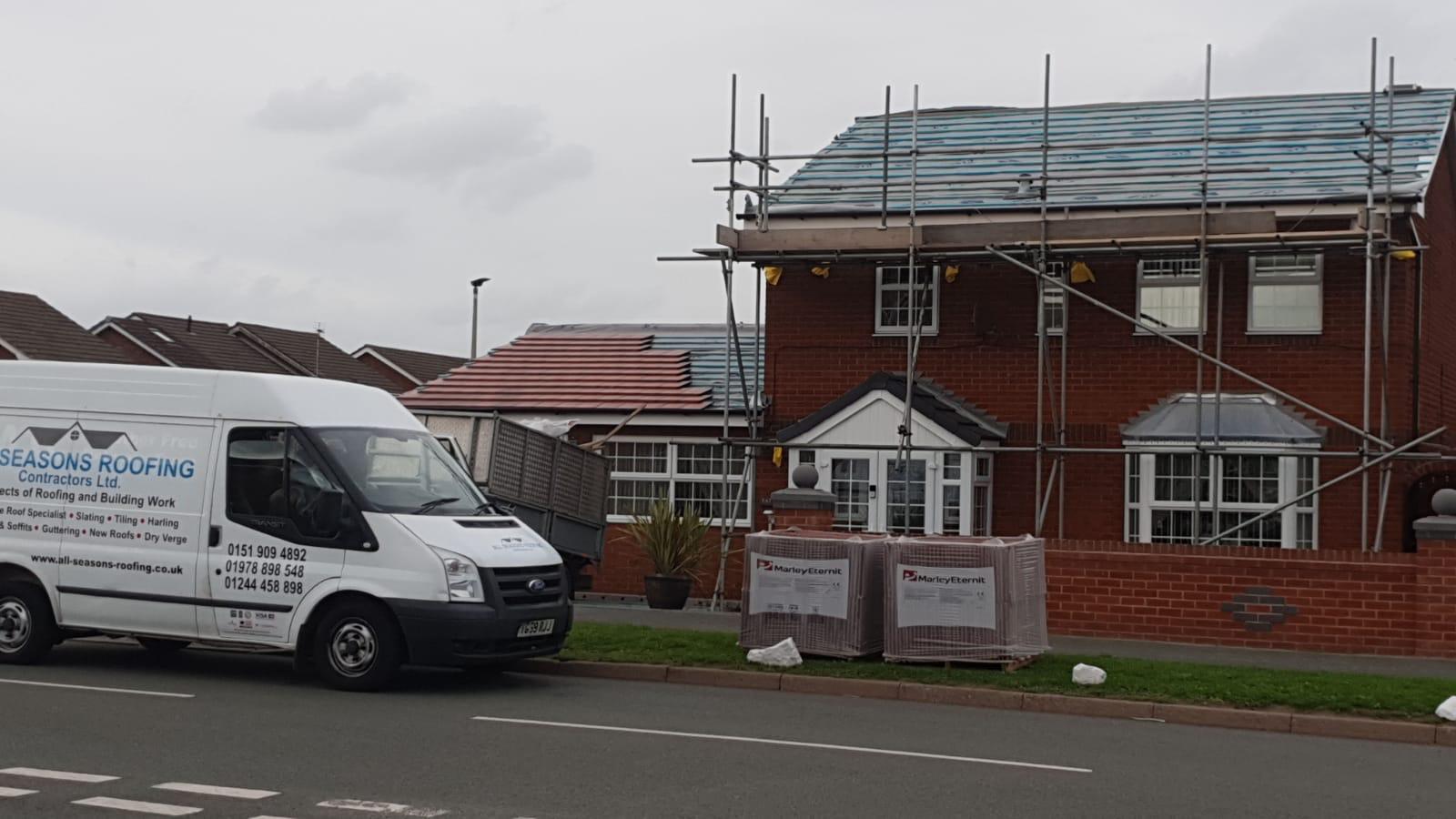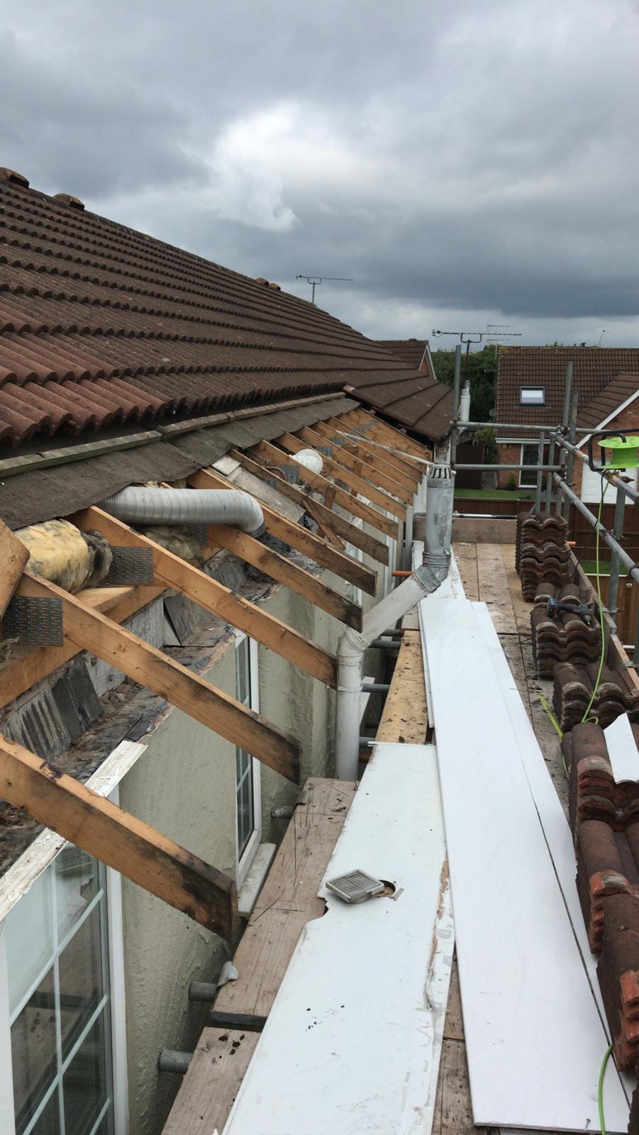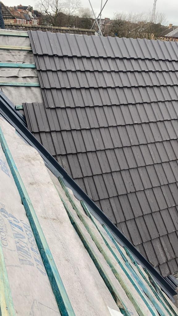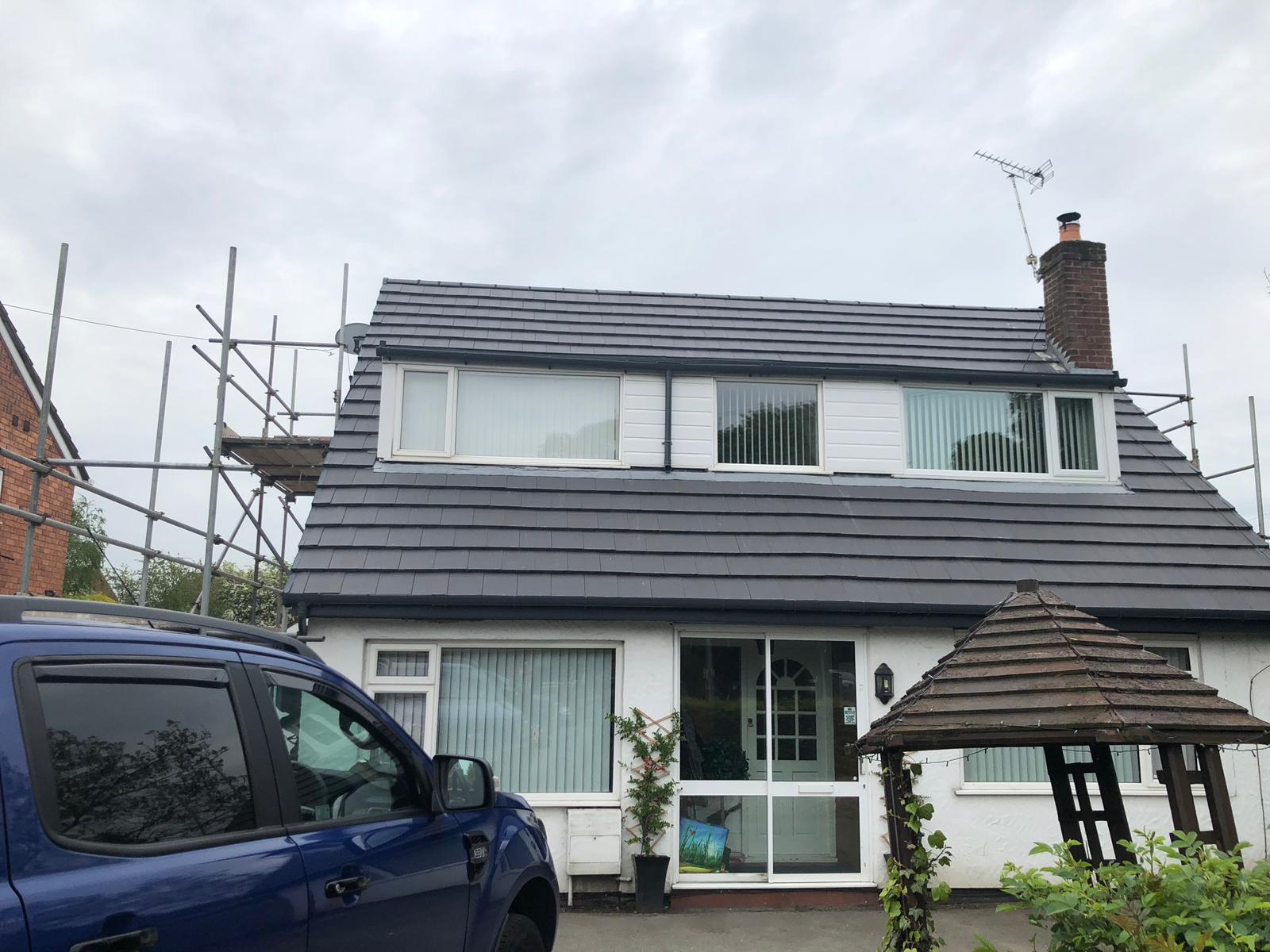 Here underway at All Seasons Roofing Contractors Ltd we have a complete new tile roof. Once the existing roof is completely stripped it will be fitted with all new breathable roofing membrane, all new roofing battens, and all new smooth grey tile, and all new matching ridges. New ridges will be fitted with a new dry ridge system. Along with that we are also fitting all new gable end timbers, all new UPVC fascia finished off with all new UPVC dry verge on the gable ends. Remember all our new roofs come with a 25 year guarantee and all UPVC work comes with a 10 year guarantee.