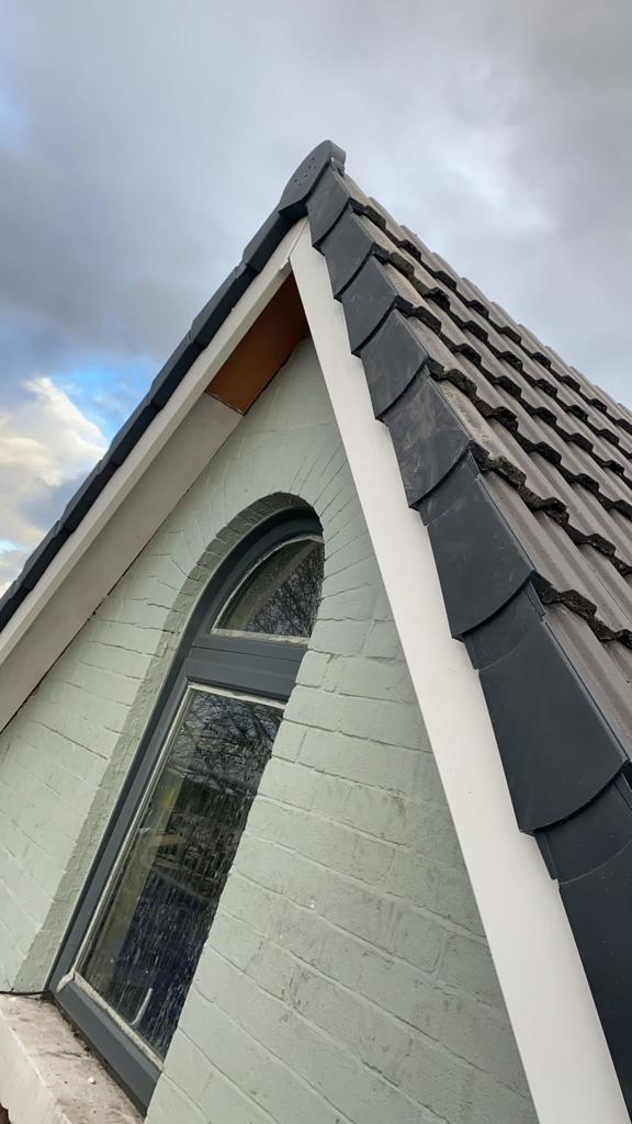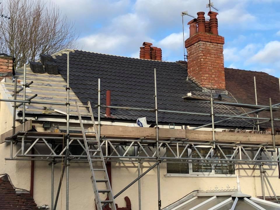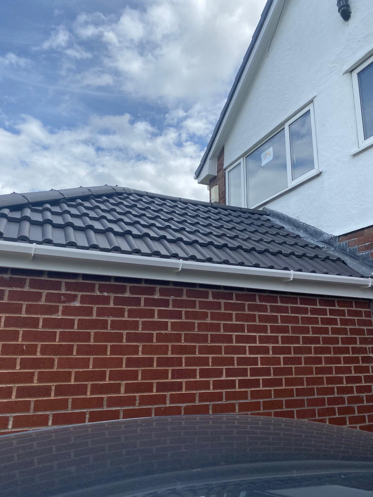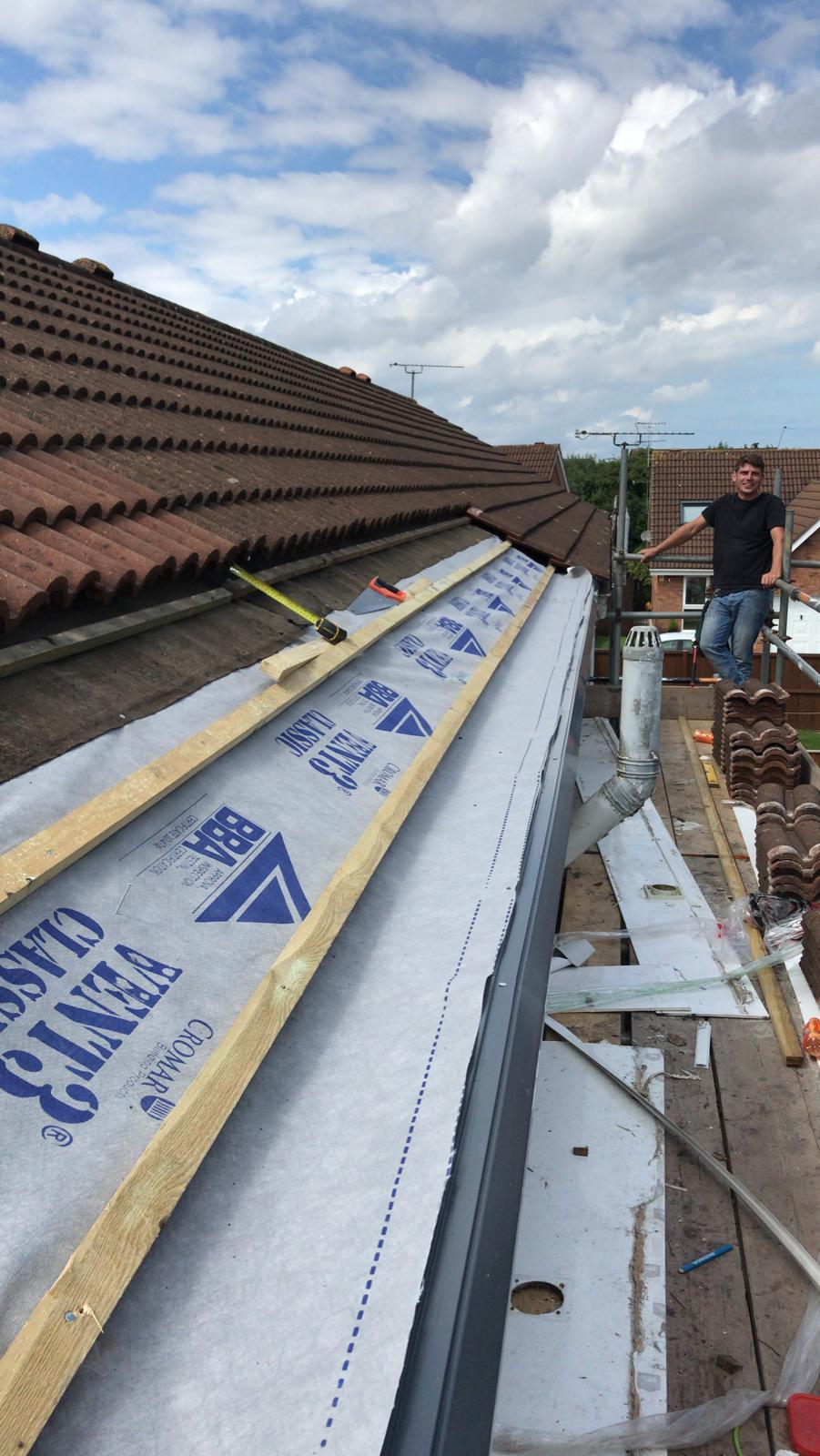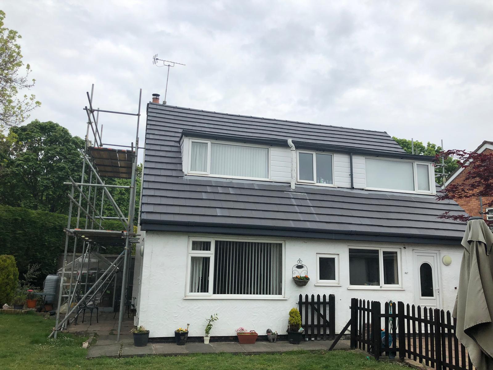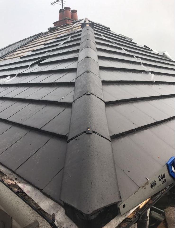 Here underway at All Seasons Roofing Contractors Ltd we have a complete new tile roof. Once the existing roof is completely stripped it will be fitted with all new breathable roofing membrane, all new roofing battens, and all new smooth grey tile, and all new matching ridges. New ridges will be fitted with a new dry ridge system. Along with that we are also fitting all new gable end timbers, all new UPVC fascia finished off with all new UPVC dry verge on the gable ends. Remember all our new roofs come with a 25 year guarantee and all UPVC work comes with a 10 year guarantee.
