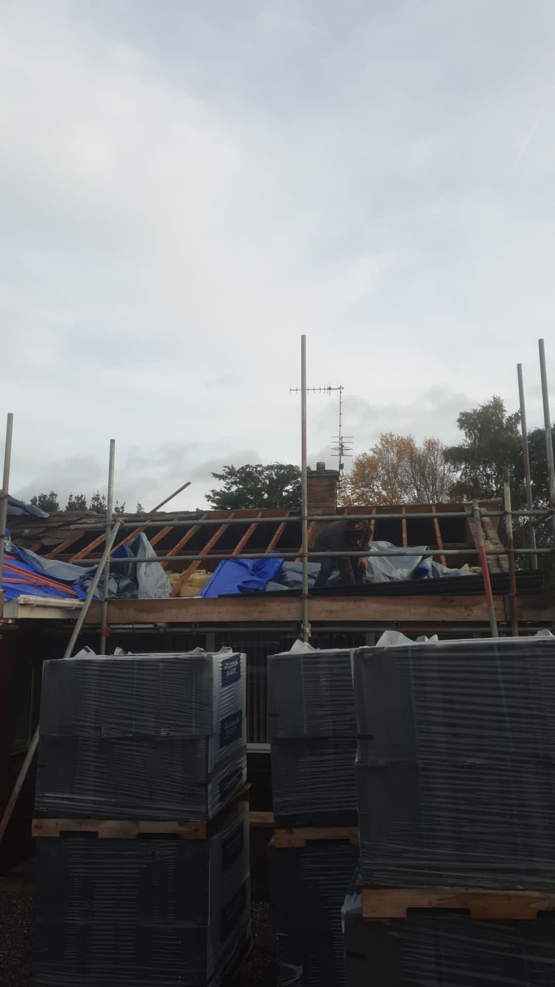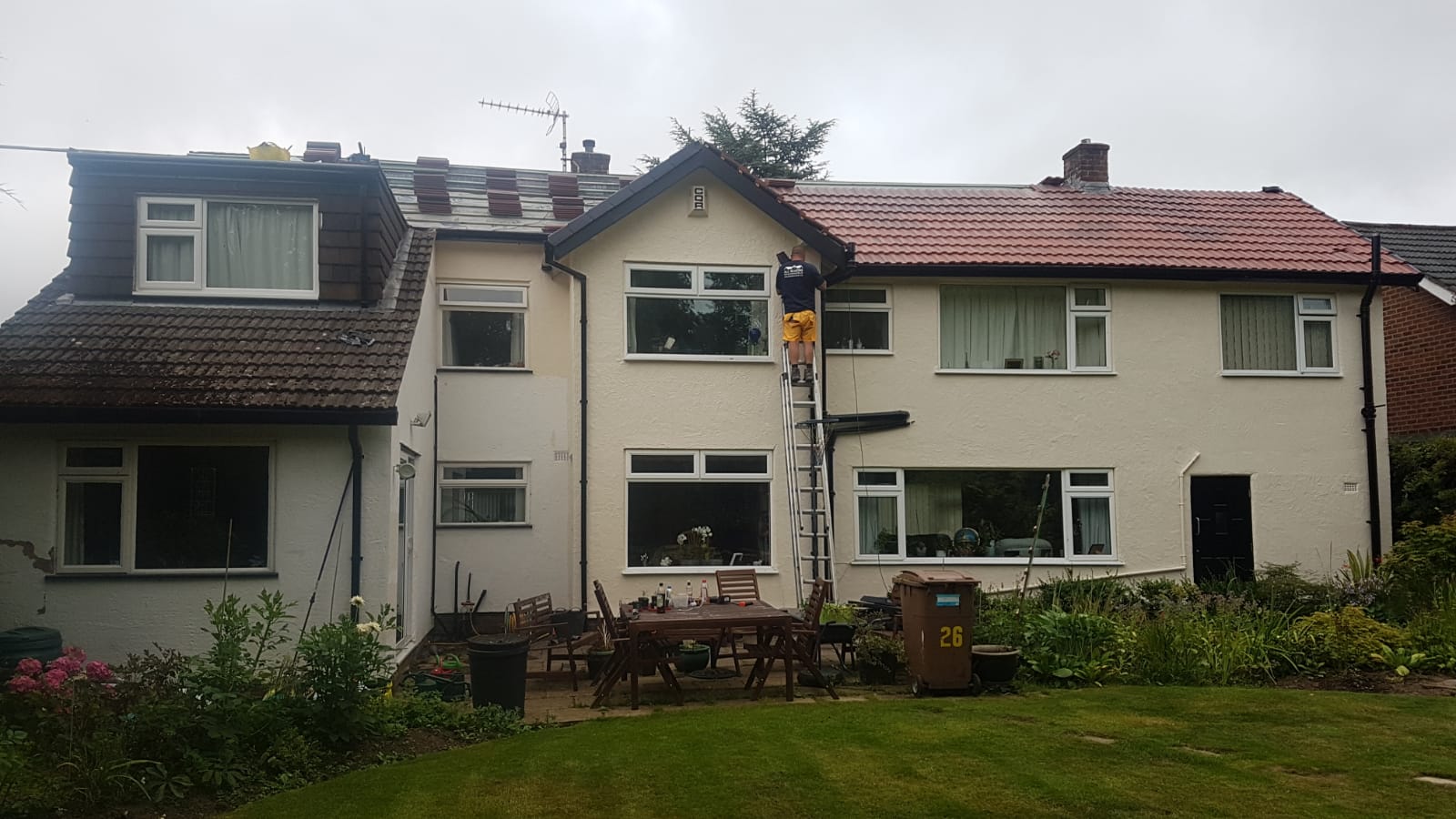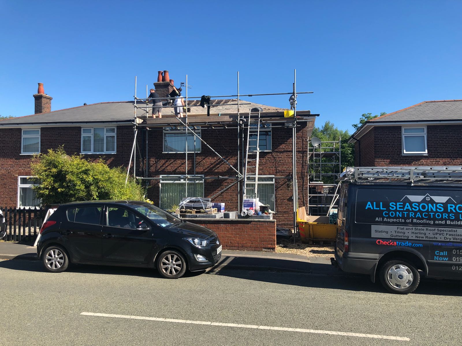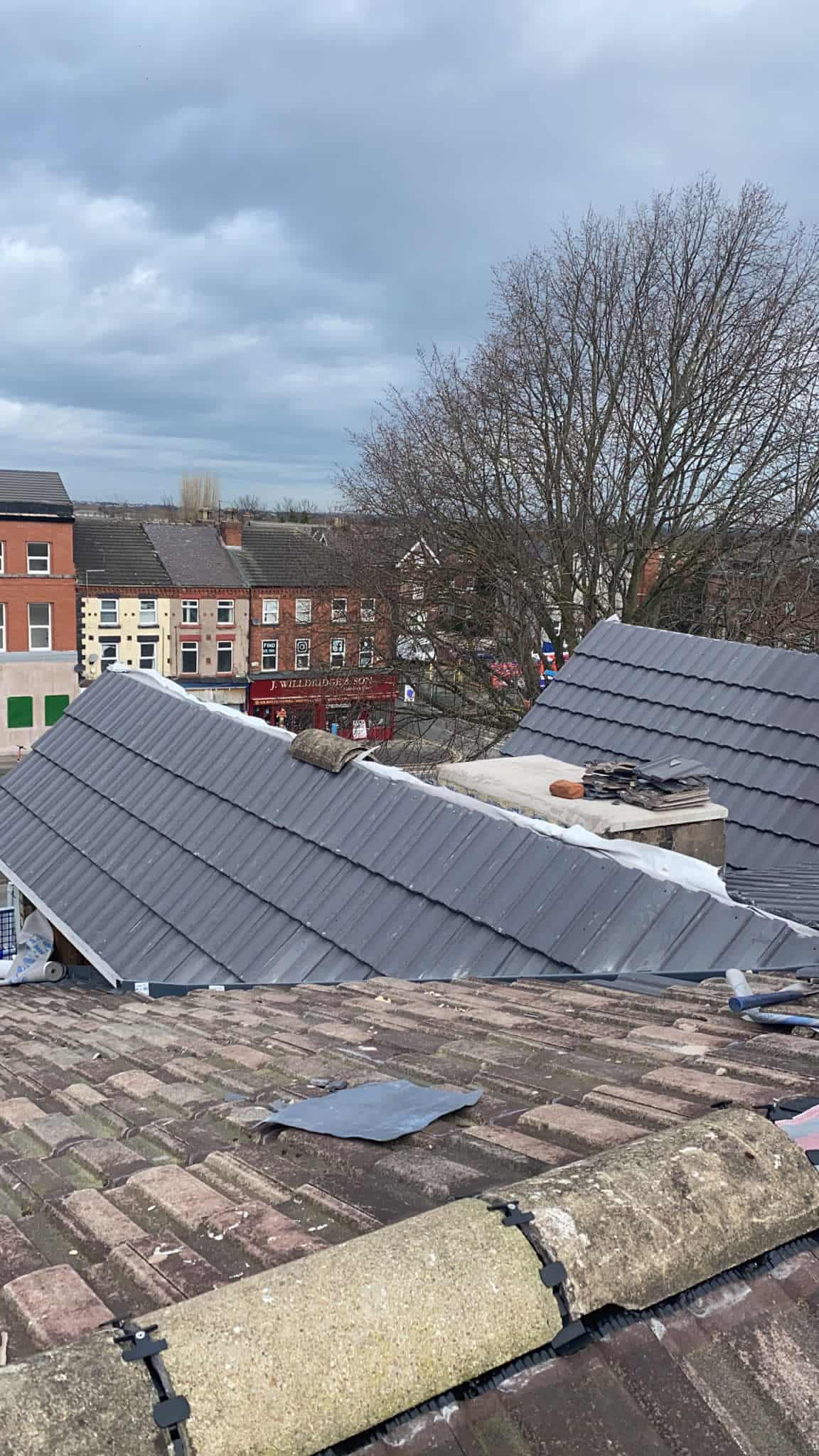 Here underway at All Seasons Roofing Contractors Ltd we have a complete new tile roof. Once the existing roof is completely stripped it will be fitted with all new breathable roofing membrane, all new roofing battens, and all new smooth grey tile, and all new matching ridges. New ridges will be fitted with a new dry ridge system. Along with that we are also fitting all new gable end timbers, all new UPVC fascia finished off with all new UPVC dry verge on the gable ends. Remember all our new roofs come with a 25 year guarantee and all UPVC work comes with a 10 year guarantee.